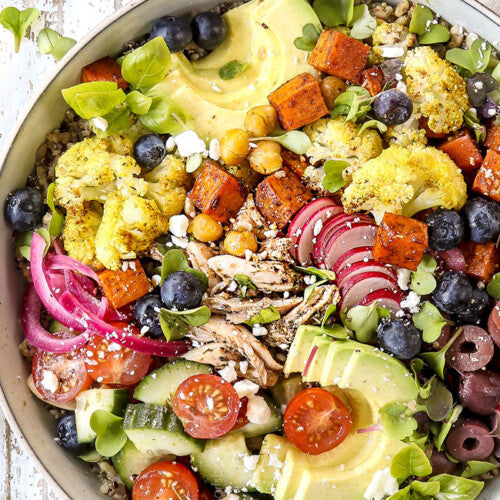 A vibrant, nourishing bowl packed with bold Mediterranean flavor! Roasted cauliflower, sweet potatoes, and chickpeas bring hearty texture and warmth, served over a bed of quinoa and crisp lettuce. Topped with Greek seasoned chicken, fresh tomatoes, cucumbers, tangy pickled onions, feta cheese, and a creamy cilantro yogurt sauce, every bite is bursting with freshness and spice. Perfect for build your own bowl night—this is wholesome comfort food done right. I’m picking my favorite toppings, but you can also add more at home. Some options for extra toppings are avocado, blueberries, radishes, olives. GF